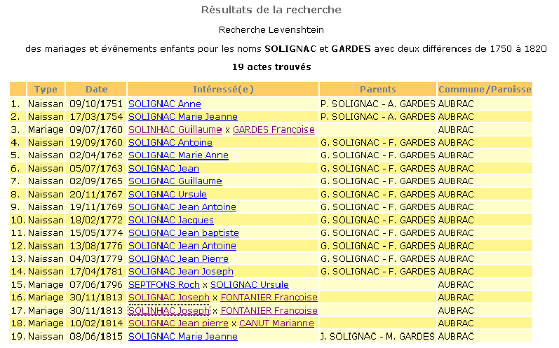 la totale : les mariages des couples, les naissances et décès de leurs enfants et les mariages de ceux ci (exemple ci dessous)